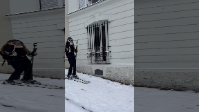 Woman Skis Through Montmartre Streets During Rare Snowfall in Paris