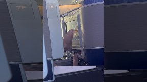 Dude Using Bare Feet to Use Airplane Screen
