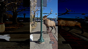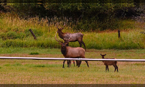 Info from Licensor: "During the elk rut, this bull had been chasing cows and running off other bulls most of the morning. He stood on a river bank with a cow and calf elk and suddenly started blowing air like he was sneezing or clearing his nostrils."