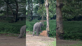 Curious Baby Elephant Checks Out Termite Nest on Tree