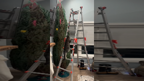 Mischievous Cat Climbs Ladder Next to Christmas Tree