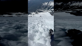 Info from Licensor: "I was facing the slope, holding the ice axe in my left hand. My watch showed 23 meters from the pass. I was already extremely exhausted, at my maximum heart rate. As I was preparing to take another step, a massive cramp suddenly hit my thigh. The pain was so intense that all I could think about was straightening my leg, while at the same time trying not to lean my body backward. I was holding the ice axe in my left hand and didn’t manage to switch it before the pain twisted me onto my side. The recording begins at the moment I realize I’m lying on a steep slope with no support points and try to drive the pick of the ice axe into the slope. Credit: Daniel Stępkowski"